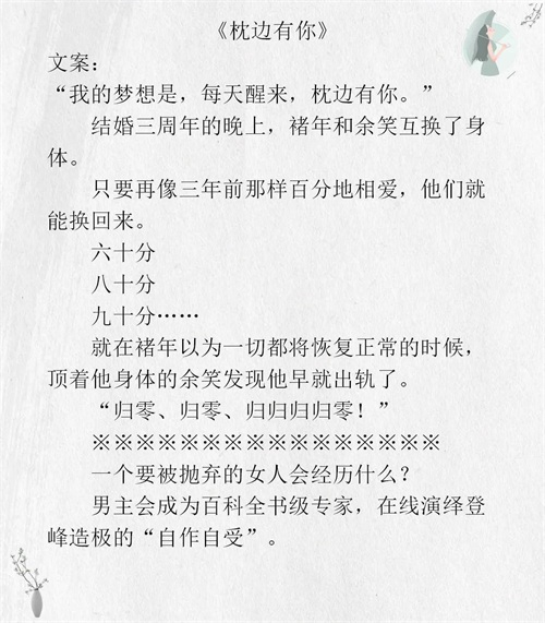 现实文,不甜,男女主身体互换,两个人之间的感情100分时才可以换回去,女主以男主的身份在职场生存,男主给女主补课时两个人感情逐渐变好,分值99分时女主发现原来男主早已出轨,只有她一个人不知道。