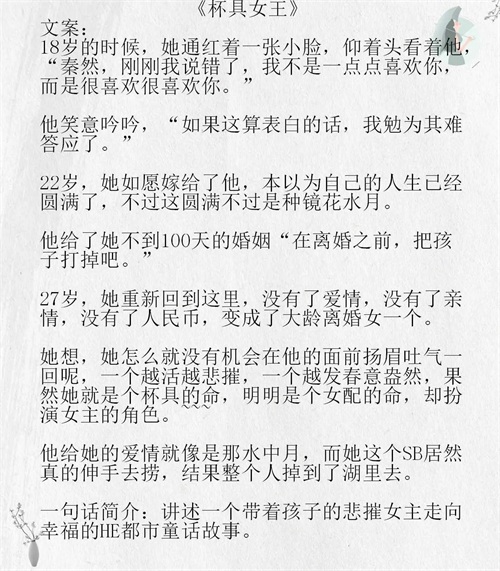 哎呀呀,男主前面又渣又心机,女主和男票非常相爱,男主妹妹是个受家人保护的小公主,妹妹从小喜欢女主的男票,为了让女主和她男票分手,男主亲身去勾引女主,勾引不成,开始怀柔接近女主男票,还化身人生指导,女主男票妈妈反对加上女主爸爸出事,终于被男主抓到机会强娶豪夺。小说看的很开心,看的时候一边骂他,一边心疼男二,为什么他们不各自离婚,破镜重圆。当然男主追妻阶段是真惨 女主一直没有原谅男主,还跑过数次,最后的最后,女主不爱女主,为了孩子试图和平共处。这篇文开头特别毒,撑过开头 进入回忆路线就能很顺畅的看下来,个人给4星推荐。