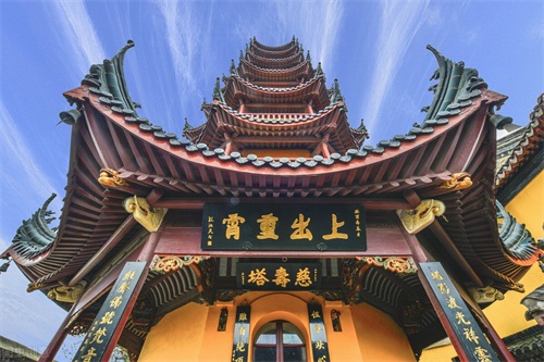 一般的寺庙都是朝南的,金山寺门则西向。因为金山原峙于江心,大江由西而东注。游人站在寺门,就能观赏"大江东去,群山西来"之壮景。