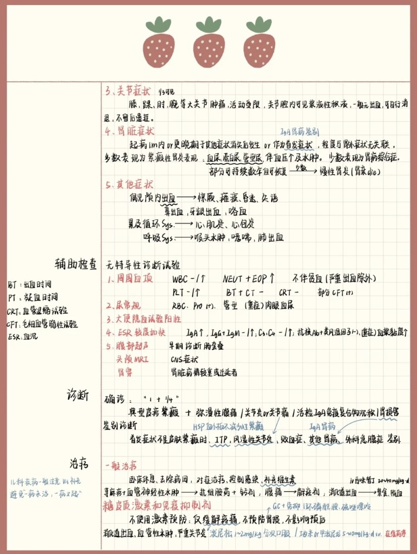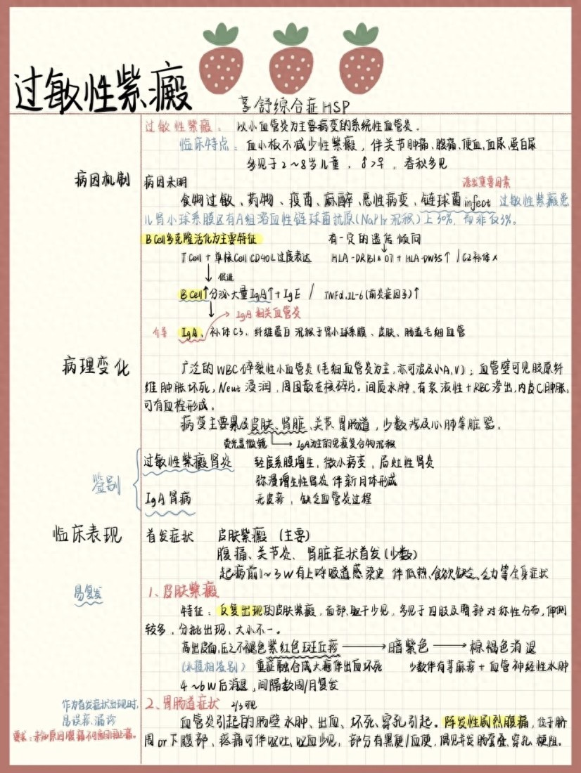4:其他症状:过敏性紫癜患者还可能伴有其他症状,如发热、关节痛、腹痛、呕吐、血尿等。这些症状可能是由于血管壁的炎症导致的。