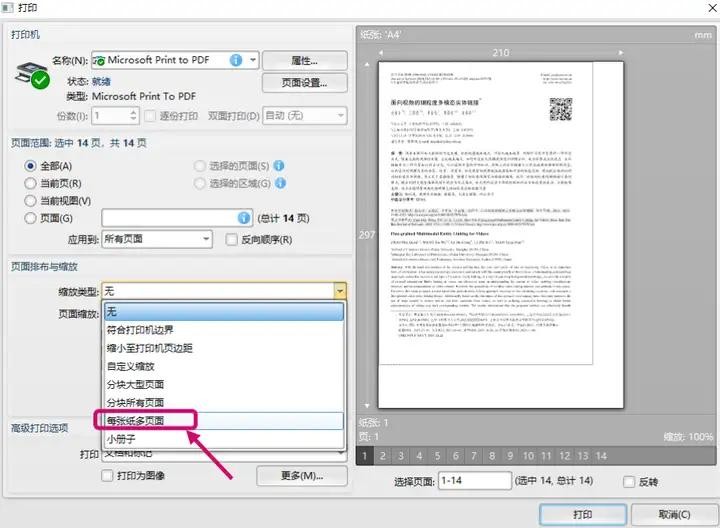 02.在弹出的打印设置框中,选中页面排布与缩放里缩放类型中的【每张纸多页面】选项