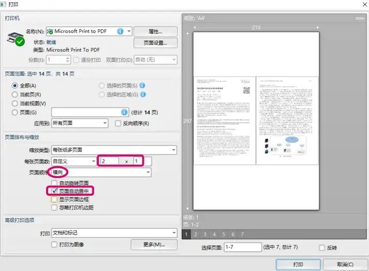 03.在每张页面数里设置为“2✖1”,页面顺序选择“横向”,勾选“页面自动居中”