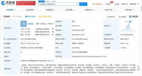 上海纽班文化发展有限公司成立于2014年7月,法定代表人为汤佩弦,注册资本约926万人民币,经营范围含组织文化艺术交流活动、广告制作、广告发布、专业设计服务、会议及展览服务、演出经纪等,由广西褐弦投资管理有限公司、李惠康、胡彦斌等11位股东共同持股。