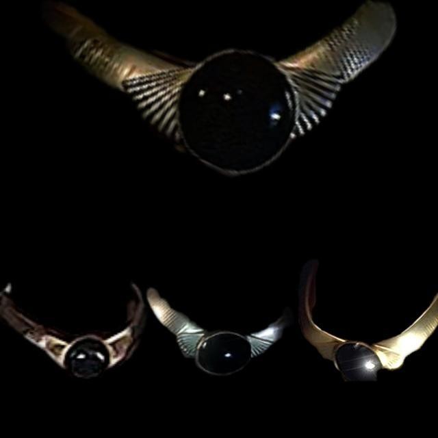 脖子上也有一个金色颈环,中间也有一块黑水晶,结构与彩色计时器相似,是卡蜜拉存储黑暗力量的主要工具。