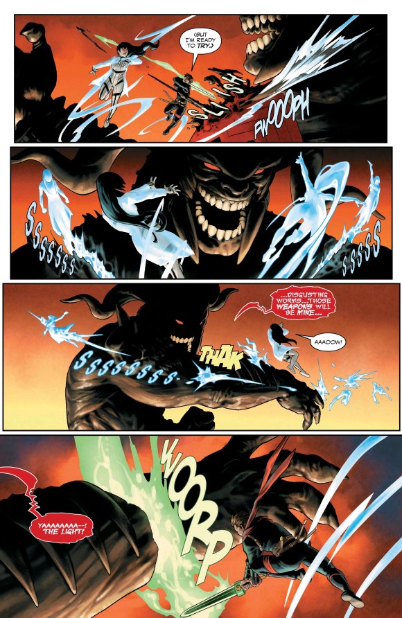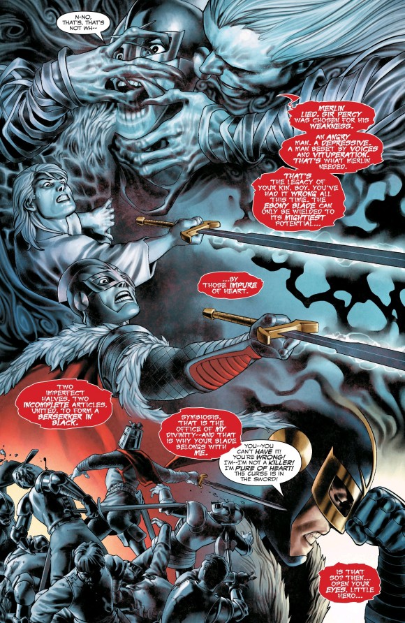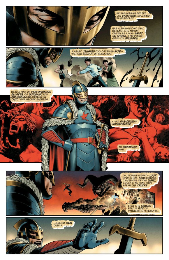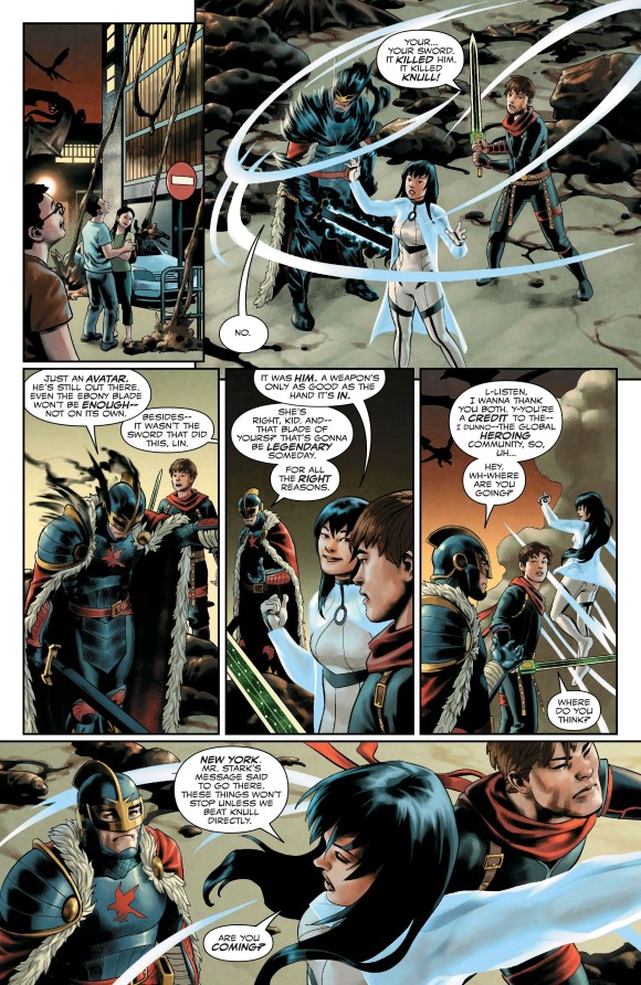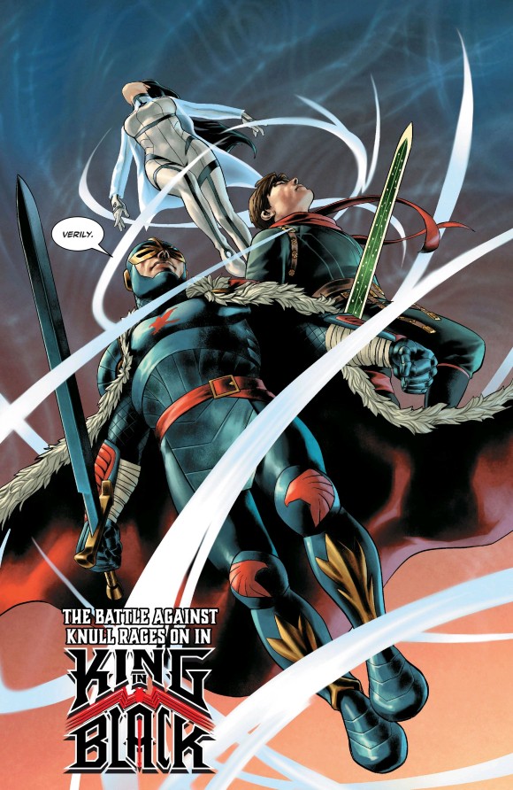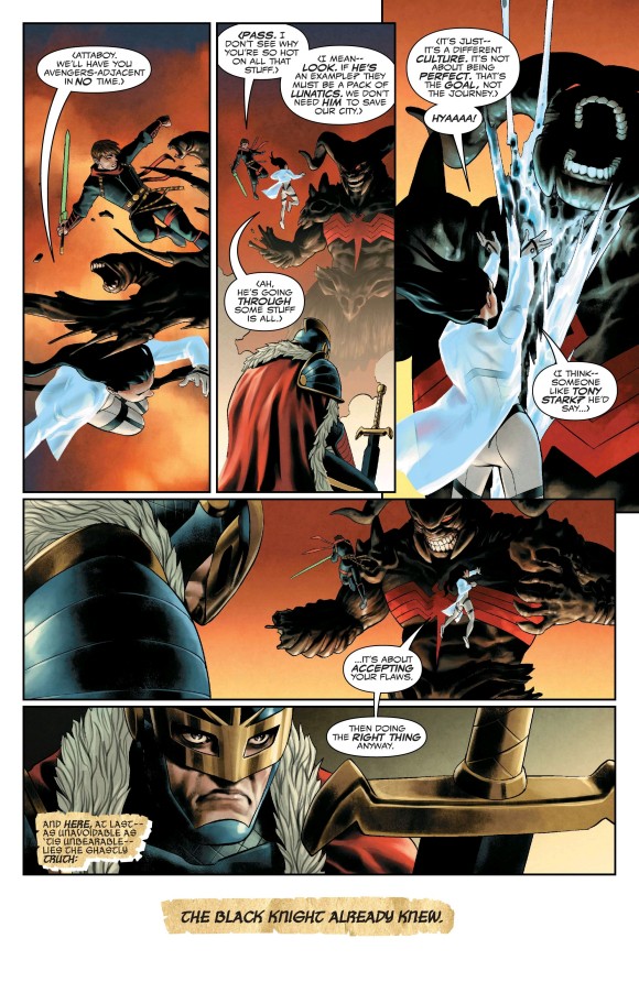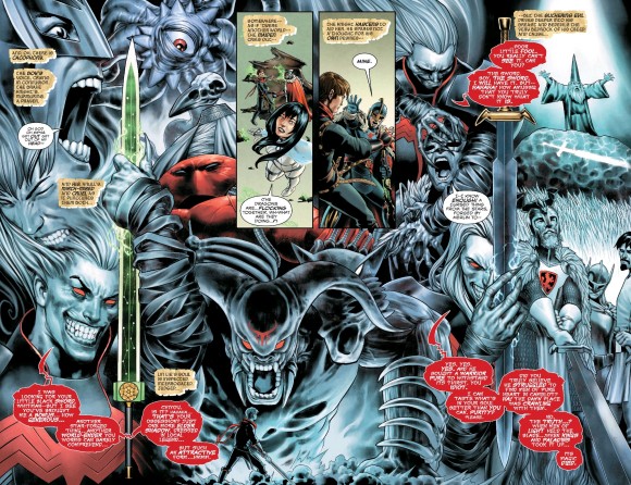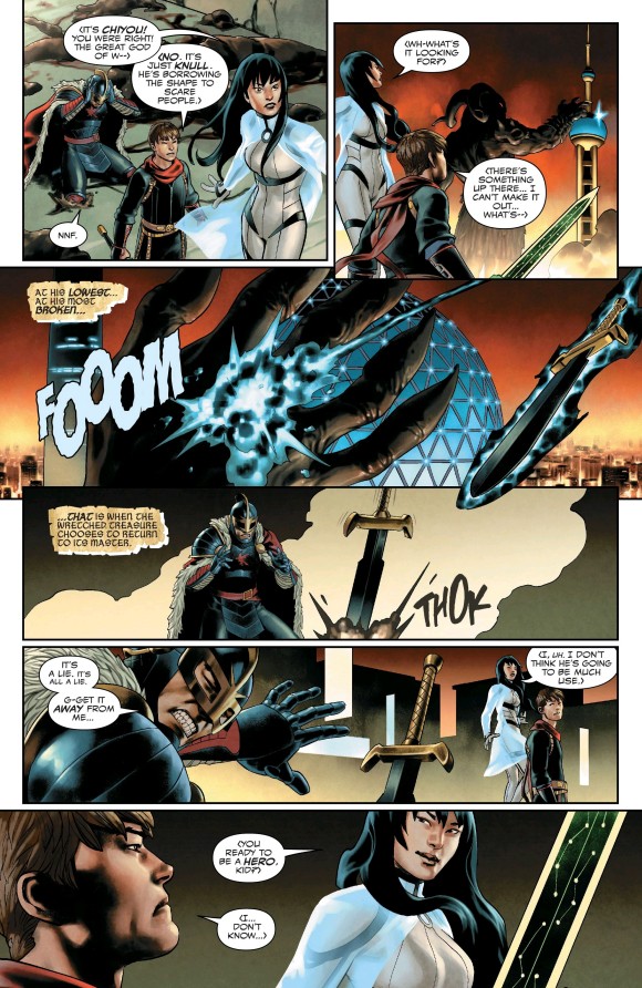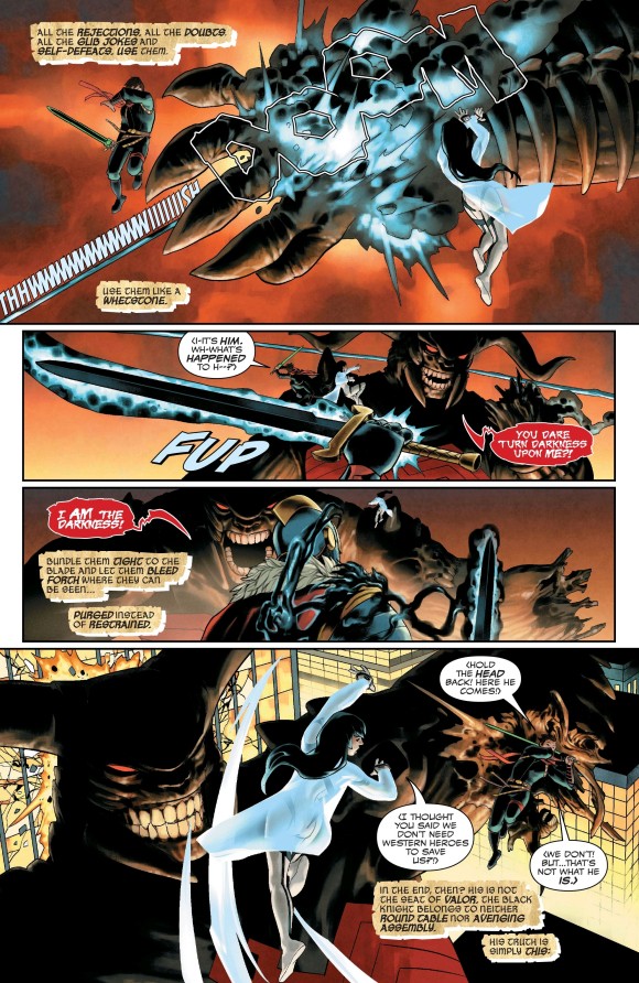 漫威大事件黑之王(king in black)支线黑剑刊,纳尔侵入了林烈(伏羲的后人)和黑骑士的精神世界,在那里称呼林烈和他远祖伏羲的大敌蚩尤为“古老的暗影”“披着当地传说的外衣”并和孔苏(后面那个乌鸦头),赛托拉克(那个红色头盔男),眼魔一类的强大魔神并列,同时表示蚩尤的外形很不错。