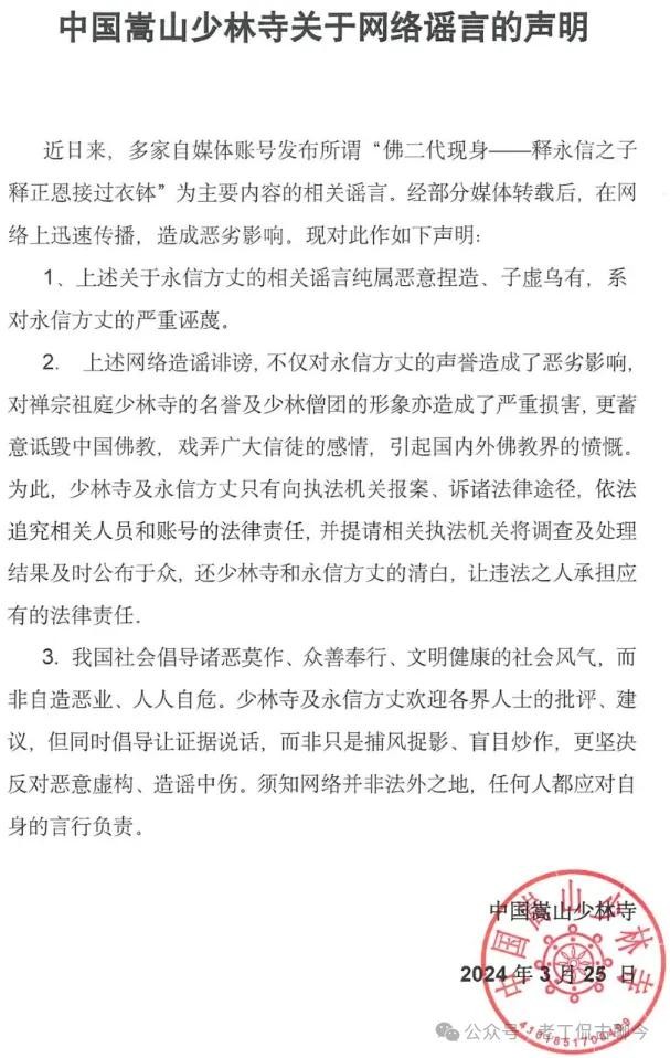 今天一早,少林寺在其官方公众号“少林寺官方网站”上发布《中国嵩山少林寺关于网络谣言的声明》,称近日来多家自媒体账号发布所谓“佛二代现身——释永信之子释正恩接过衣钵”为主要内容的相关谣言,经部分媒体转载后,在网络上迅速传播,造成恶劣影响。为此,少林寺方面还进一步作了三点声明。