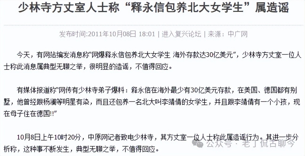 尤为值得一提的是,此次也并非释永信首度陷入桃色纷扰,像是2011年5月,有传言称释永信嫖娼被抓;2011年10月,亦一度有传言称“释永信包养北大女学生”;2015年7月,在当时“释正义”的网帖和释延鲁等人的举报中,都提到释永信有两个“私生女”。不过,有关传言后续均被证明为不实。