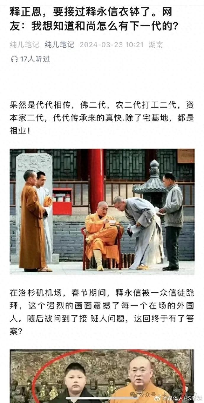 话题性一直不算缺的少林寺方丈释永信,近日又陷入有关“佛二代”的舆论纷扰中。根据此前一些自媒体发布的消息,释永信之子释正恩据说将接过其父亲的衣钵,后者也由此有了所谓“佛二代”的称号。