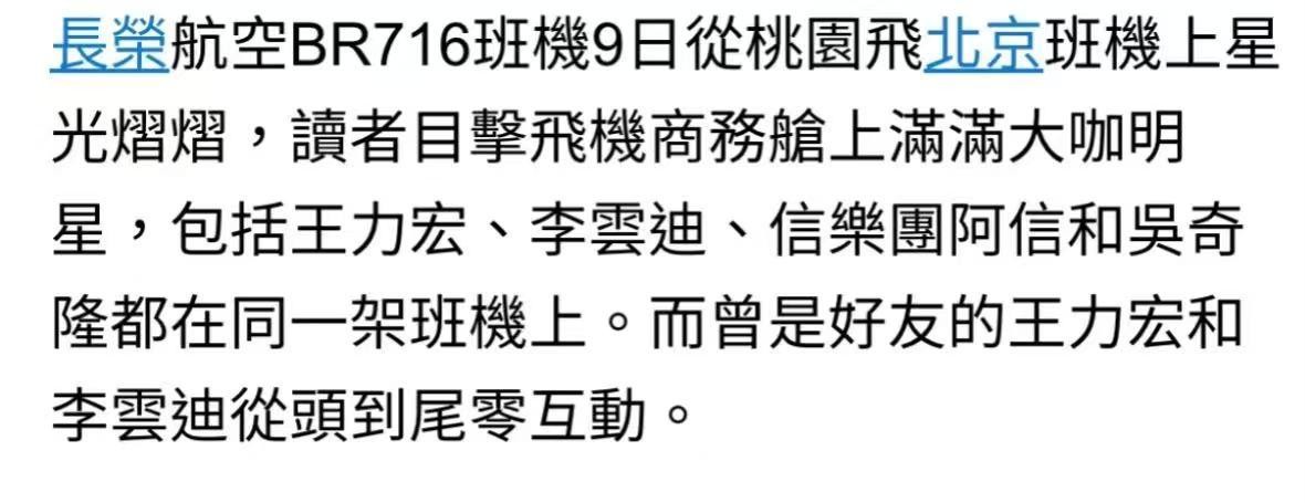 飞机上有四位男星,王力宏、李云迪、信乐团阿信以及独自返京的吴奇隆。