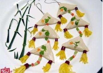 主料 :南方豆腐 辅料 :三鲜馅、胡萝卜、冬瓜调料 :味达美味极鲜酱油制作 :1、南方豆腐切成正方形(3×3cm) ;2、三鲜馅用南方豆腐包成三角形,涂上蛋清糊,上蒸车蒸熟,取出摆好形,浇上味达美味极鲜酱油,淋热油即成。3、造型装饰采用扇尾采用鸡蛋皮 辣椒段 香菜 胡萝卜等 最后用东瓜皮刻成竹子特色 :色泽艳丽、口感滑嫩。