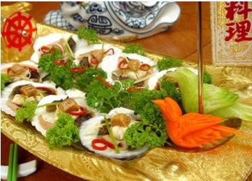 主料:夏威夷贝辅料:海肠、自发刺参、干贝调料:味达美味极鲜酱油、青芥辣、青红椒丝、葱姜制作:1、先将夏威夷贝、海肠处理好,刺参、干贝发制好,改形;(按照一盘凉拌海鲜的方式处理好)2、把原料入夏贝壳内,一齐放入调料,码盘后淋油即可。特色:选料考究,做工精细,造型新颖, 滋补养颜