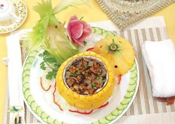 主料:鱼米、牛柳粒辅料:松子调料:味达美味极鲜酱油、味达美蚝油制作:1、将鱼切成米粒状滑熟后,清炒装入用南瓜雕好的容器中;盘底用琼脂融化后加入青菜汁做成青色池塘造型2、将牛里脊粒用味达美味极鲜酱油腌制后,滑油加入味达美味极鲜酱油爆炒即可。特色:造型美观大方,口味香醇。制作此菜需要有雕刻技巧
