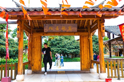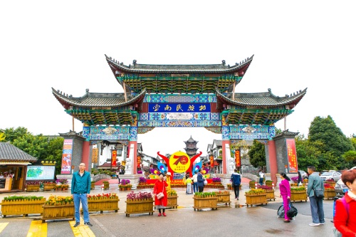 乘车来到民族村的门口购票入内。它的大门是一座造型典雅恢宏的钢架式建筑,上面悬挂着云南民族村5个大字,中间是展翅腾飞的孔雀图标。