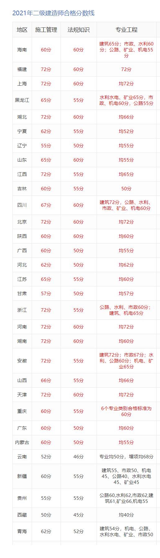 例如2021年二建合格标准:60%及格线是管理72分,法规60分,实务专业72分