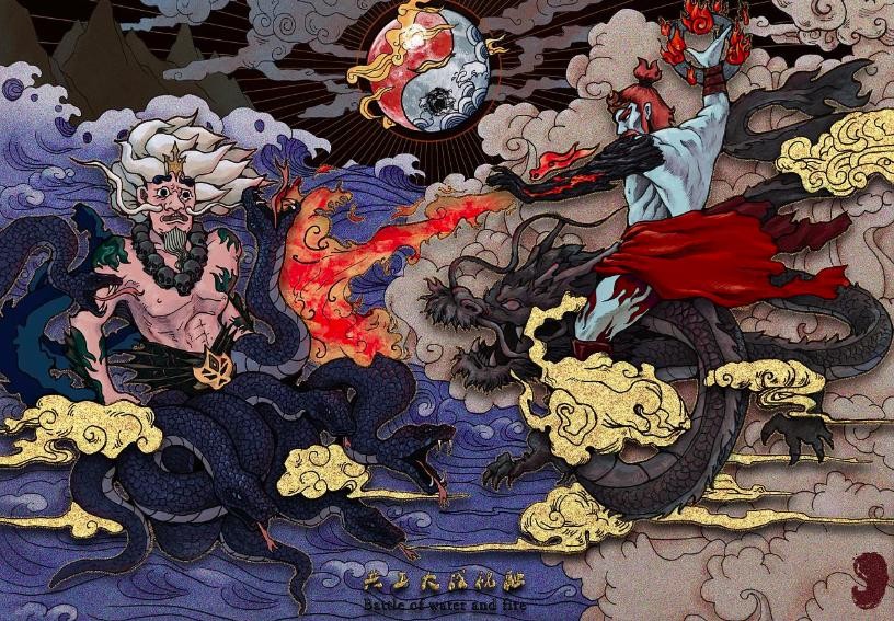 中国神话中第一次大洪水,起因于远古时代,共工和祝融大战。共工兵败,一头撞向撑天支柱不周山,柱子断后,半边天塌下来,天上露出大洞,大地也裂成沟痕,洪水遂从地底喷涌而出。