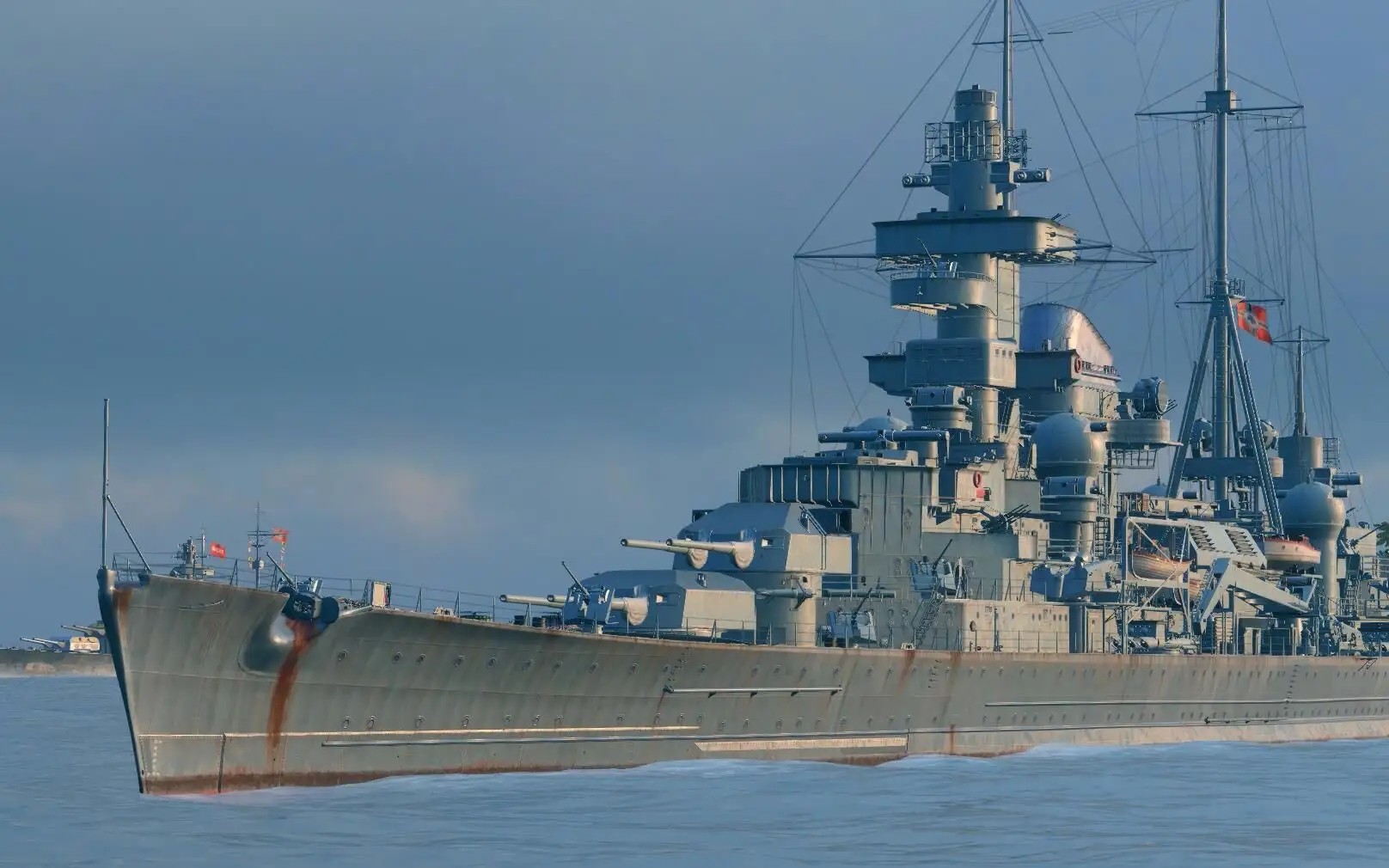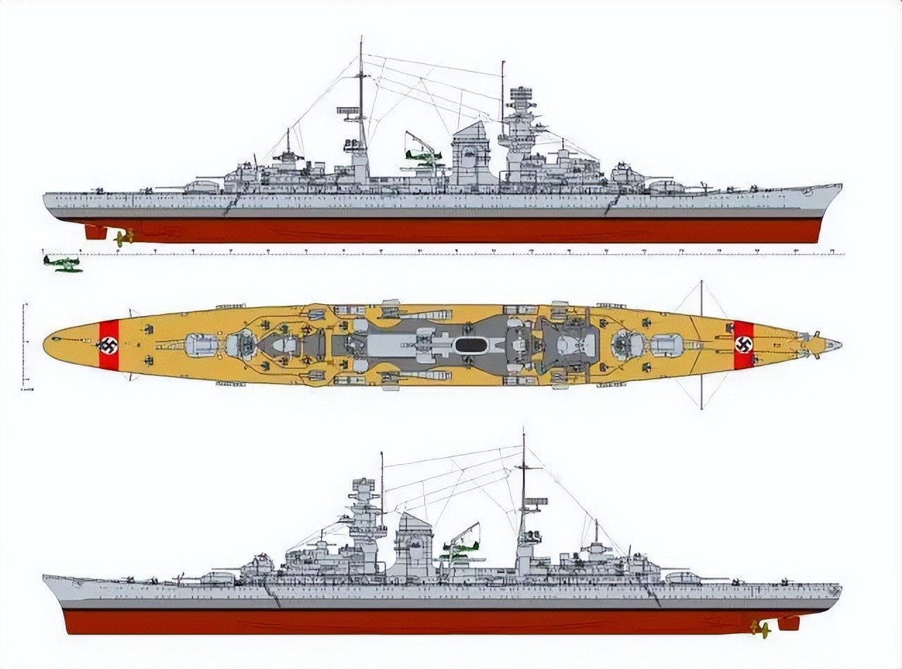1938年8月22日欧根亲王号下水,该舰标准排水量14240吨,满载排水量18500吨,装大小舰炮38门,舰体装甲最厚处达80毫米,最大航速32.5节,乘员1600人。