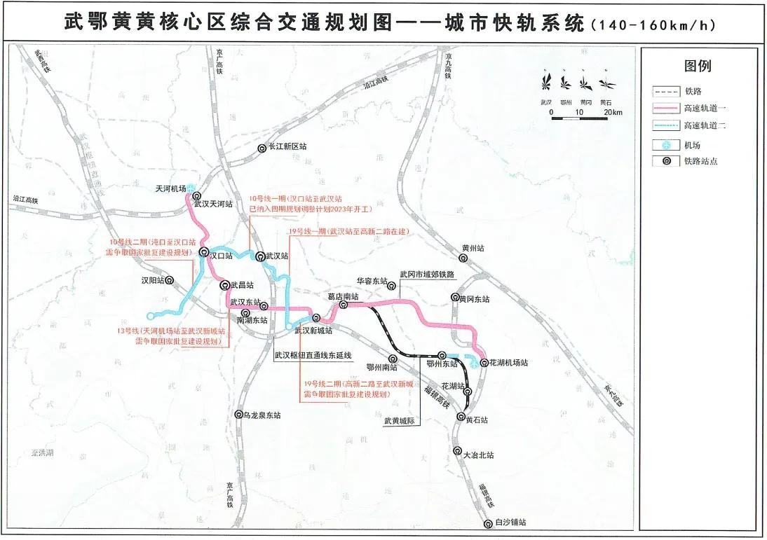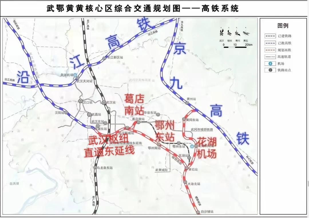 武鄂黄黄区域内规划4条高铁,即京广高铁、“十四五”规划建设的沿江高铁、京九高铁(阜黄段)、福银高铁(武汉枢纽直通线)。将积极争取新增武汉枢纽直通线东延线(南湖东—葛店南),在武黄高速南侧设武汉新城站,通过既有武冈城际,接入京九西通道。