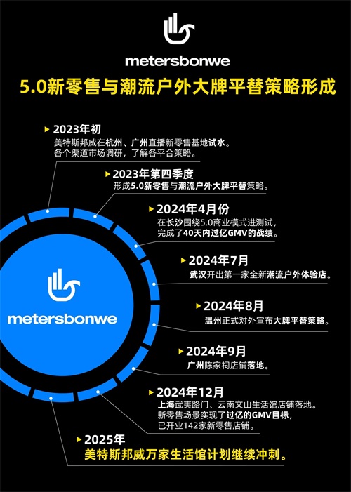 一切的努力没有白费,自2024年7月份在武汉开出第一家全新潮流户外体验店以来,已经在全国开业了142家新零售店铺,还有38家加盟门店在装修中即将开业。根据预算模型显示,这些门店将会在2025年为美特斯邦威带来过亿的收入。