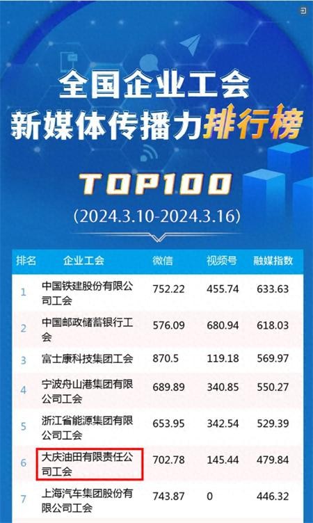 在中工网权威发布的全国企业工会新媒体传播力百强名单中,大庆油田工会新媒体(公众号、视频号)榜上有名,本周从第20位跃居全国第6位,与中国铁建、邮储银行、富士康科技、宁波舟山港集团等大企业工会同处第一梯队。