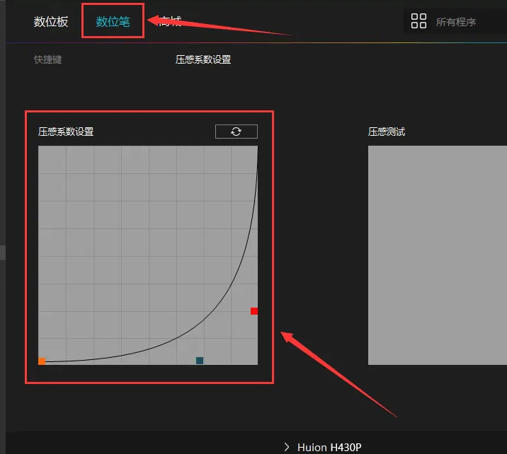 4、点击Huion Tablet图标,然后在驱动内选择数位笔,对压感进行调试,设置完之后打开夏天自带的手写输入面包,就可以用电脑手写板进行手写文字了。