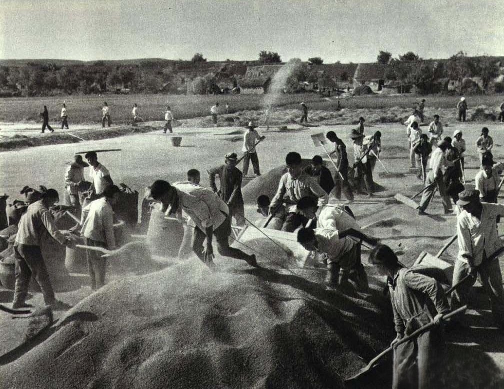 人民公社是总路线和大跃进的产物。1958年8月,中央决定推行人民公社化运动,撤销乡镇,小社并大社,以政社合一的人民公社行使乡镇政府职权,村级农业生产合作社改称生产大队。大队下辖生产队,设立队务委员会,选举队长、副队长、妇女副队长、会计(兼记工员)、保管员。实行“一大二公”“一平二调三收款”“三级所有,队为基础”制度。农民(当年称人民公社社员,简称社员,也叫劳力)在生产队的贡献用工分来记录,叫 “挣工分”。工分是劳动成果的唯一记录和进行分配的唯一依据。