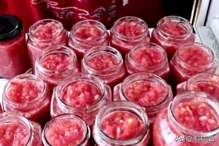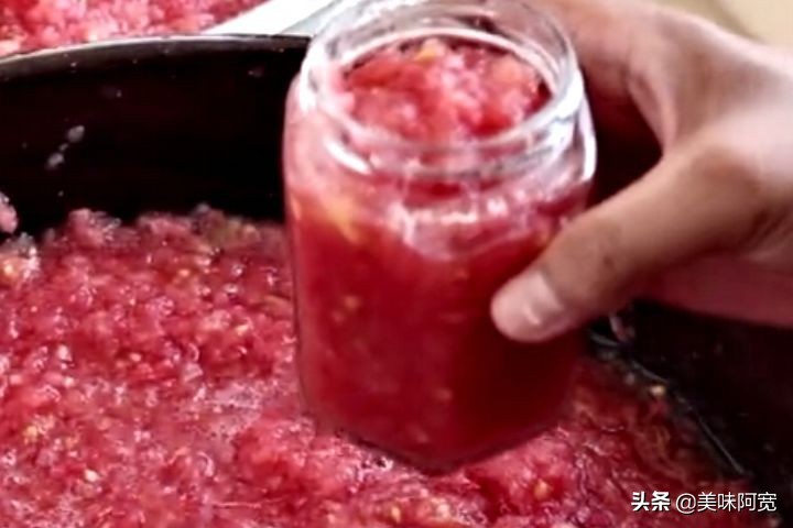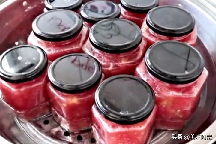 2:多准备几个无水无油的瓶子,把西红柿装在里面,要记得把瓶盖拧紧实了,然后放在锅里蒸,凉水上锅蒸,水开蒸40分钟,时间到千万不要出锅,先关火焖30分钟,最后出锅放在阴凉干燥的地方储存就可以,西红柿酱上锅蒸,这一步千万不要忽略,上锅蒸的西红柿,算是真空包装了,这样储存一年都不坏。