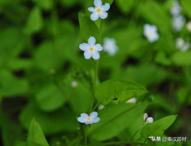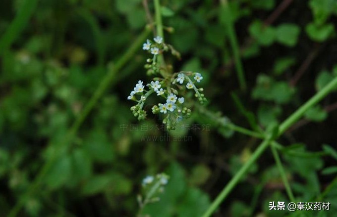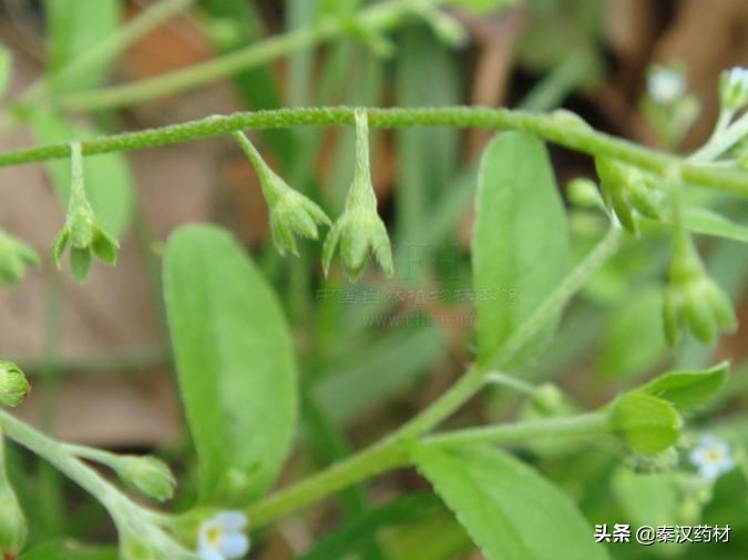 【性状】性状鉴别全草我皱缩成团。湿润展开后,根细长圆锥形。茎1至数条,纤细我分枝,基部淡紫棕色,上部枯绿色,有短糙毛。基生叶有长柄,叶片椭贺状卵形,长可达2cm,两面有糙毛,茎生叶几无柄,叶片稍小。总太花序细长,可达20cm,可分类白色或蓝色小花,有时具四面体形的小坚果。有青草气,味微苦涩。