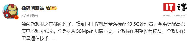 该博主透露,华为新旗舰工程机是全系标配 K9 5G 处理器(麒麟 9XXX),全系标配高密度电芯、无线充、 50Mp 超大底主摄、潜望长焦镜头、卫星通信技术等等。