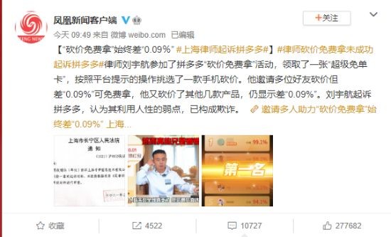 事情是这样的,在2022年1月15日,一位律师网友对拼多多“砍价”活动的起诉冲上了热搜。据这位网友的自述,他在参与拼多多砍价活动时领取了“超级免单卡”、“0元免费领商品”,然后按照提示操作去邀请好友来砍价,可在砍到99.9%之时进度条就不再动了,即便是又多邀请了几位朋友,还是无法补上这0.1%。