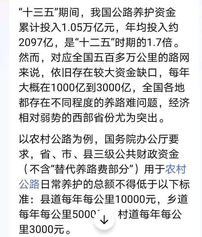 “十三五”期间,我国公路养护资金累计投入1.05万亿元,年均投入约2097亿,是“十二五”时期的1.7倍。然而,对应全国五百多万公里的路网来说,依旧存在较大资金缺口,每年大概在1000亿到3000亿,全国各地都存在不同程度的养路难问题,经济相对弱势的西部省份尤为突出。