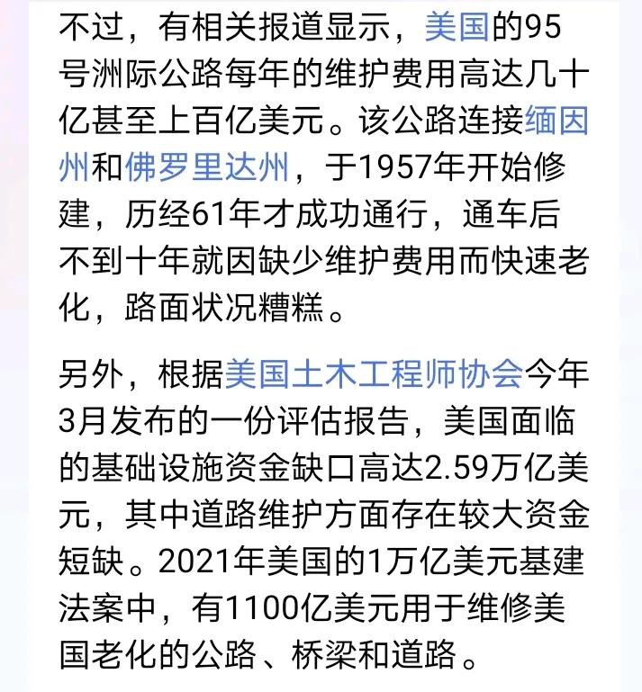 根据美国土木工程师协会今年3月发布的一份评估报告,美国面临的基础设施资金缺口高达2.59万亿美元,其中道路维护方面存在较大资金短缺。2021年美国的1万亿美元基建法案中,有1100亿美元用于维修美国老化的公路、桥梁和道路。
