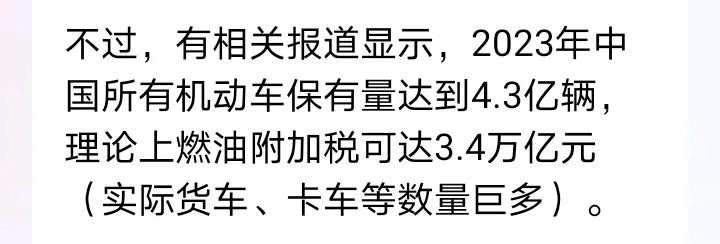 有相关报道显示,2023年中国所有机动车保有量达到4.3亿辆,理论上燃油附加税可达3.4万亿元(实际货车、卡车等数量巨多