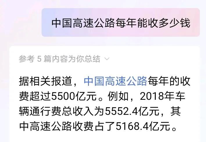 相关报道,中国高速公路每年的收费超过5500亿元。例如,2018年车辆通行费总收入为5552.4亿元,其中高速公路收费占了5168.4亿元。