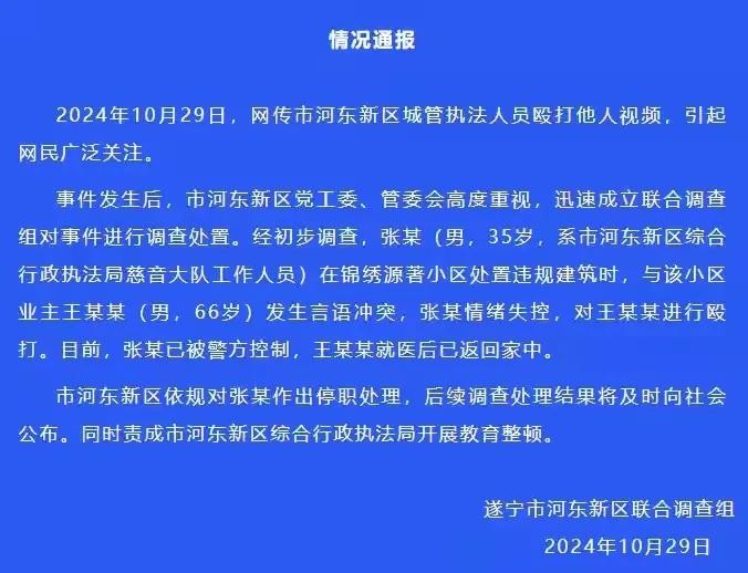据了解,该事件发生在市河东新区锦绣源著小区,涉事城管执法人员张某(男,35岁)在处置违规建筑时,与该小区业主王某某(男,66岁)发生了言语冲突。在冲突中,张某情绪失控,对王某某进行了殴打。这一行为不仅严重违反了法律法规,也违背了城管执法人员应有的职业操守和道德规范。