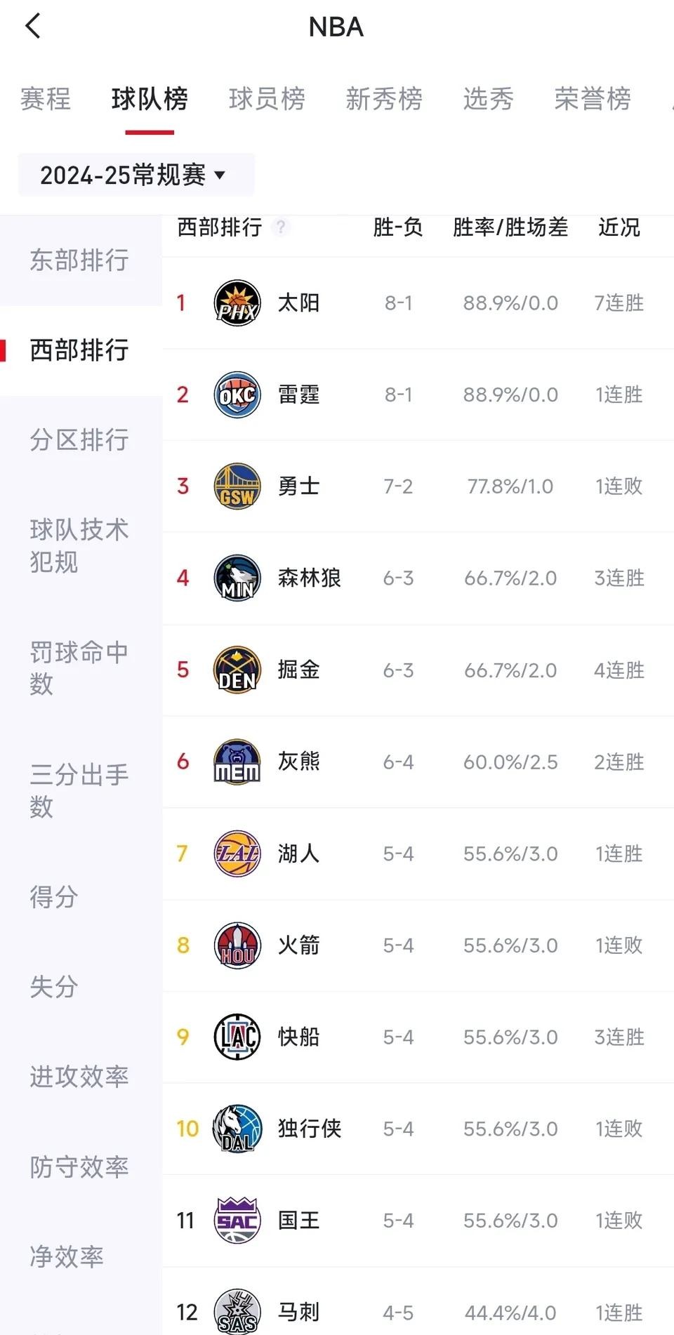 西部排名第二的是雷霆,目前战绩8胜1负,战绩跟太阳一样。雷霆常规赛表现一直都比较出色,队里有亚历山大和霍姆格伦这样的球星,另外威廉姆斯本赛季表现也相当出色,也是在大家的意料之中。