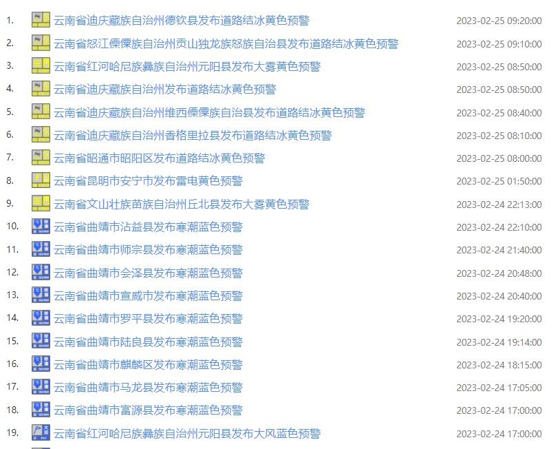 云南省气象台连发19条预警