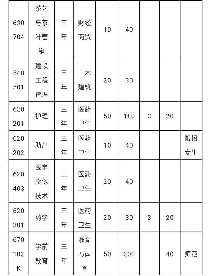 黄山职业技术学院2020年分类考试招生计划