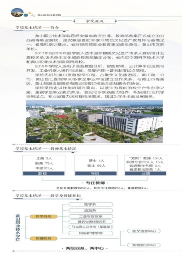 黄山职业技术学院是经安徽省政府批准、教育部备案正式成立的公办高等职业院校,是安徽省首批30家非物质文化遗产教育传习基地之一、省高师培训基地、省财经商贸职业教育集团成员单位、黄山市文明单位。