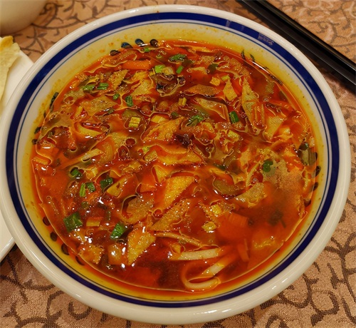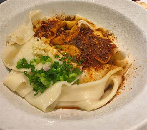 biangbiang面,这种面因扯面时发出的声音而得名,最大的特色就是面宽而厚,口感劲道,油泼辣子浇上葱花、臊子肉筋道的面条、酸甜可口的臊子,再配上灵魂——油泼辣子,美滴很!