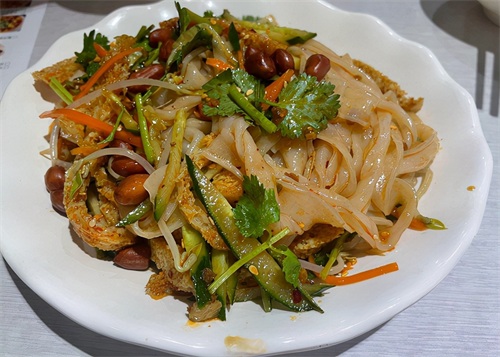 西安凉皮有两种:一种是面粉揉成团,用洗面筋洗出的淀粉蒸制的。另一种叫“秦镇米皮”,是用大米淀粉蒸制的,制作过程有点类似于广式肠粉。西安凉皮讲究的是皮薄油香,看着感觉很辣,吃起来软糯有嚼劲,辣椒油的焦香与秘制的酱料合二为一,搭配吸满是酱汁的青瓜和腐竹,酸辣开胃,非常解馋!