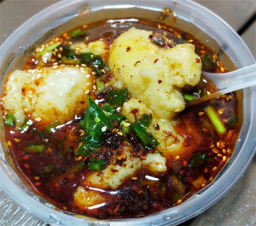 西安柞水洋芋糍粑,被誉为非物质文化遗产,洋芋用木锤压开,来回揉一两个来回就粘呼呼,捶好的滋粑柔若无骨,放在砧板上,用刀使劲一切,整坨、整块的,柔而不散,很有劲道。放在调料锅里烫热时,香气直往鼻孔里钻,很是诱人,胃口大开。