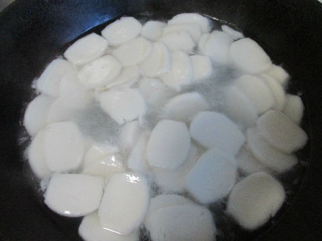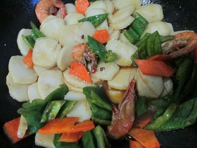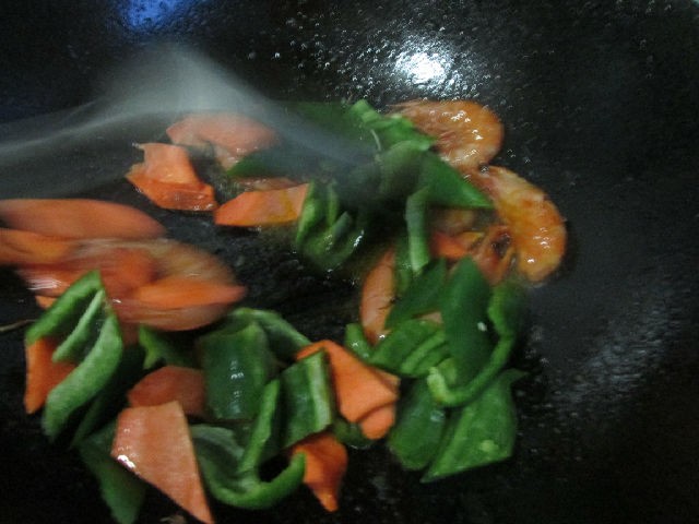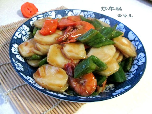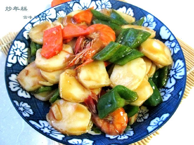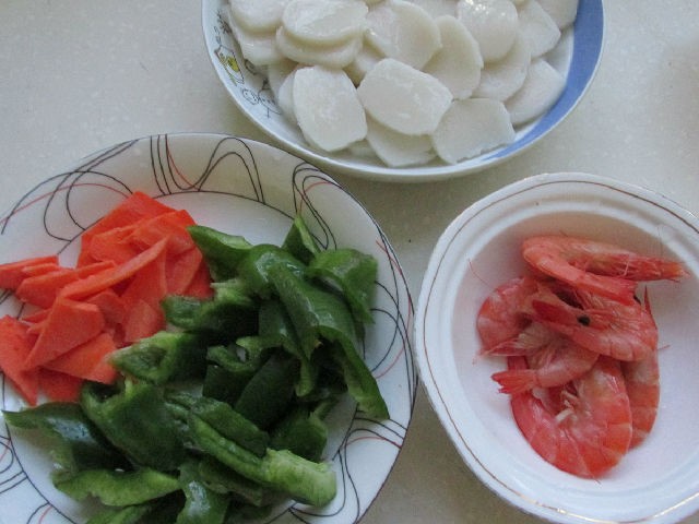 2,年糕片捞出,青椒,胡萝卜切片,红虾备用。