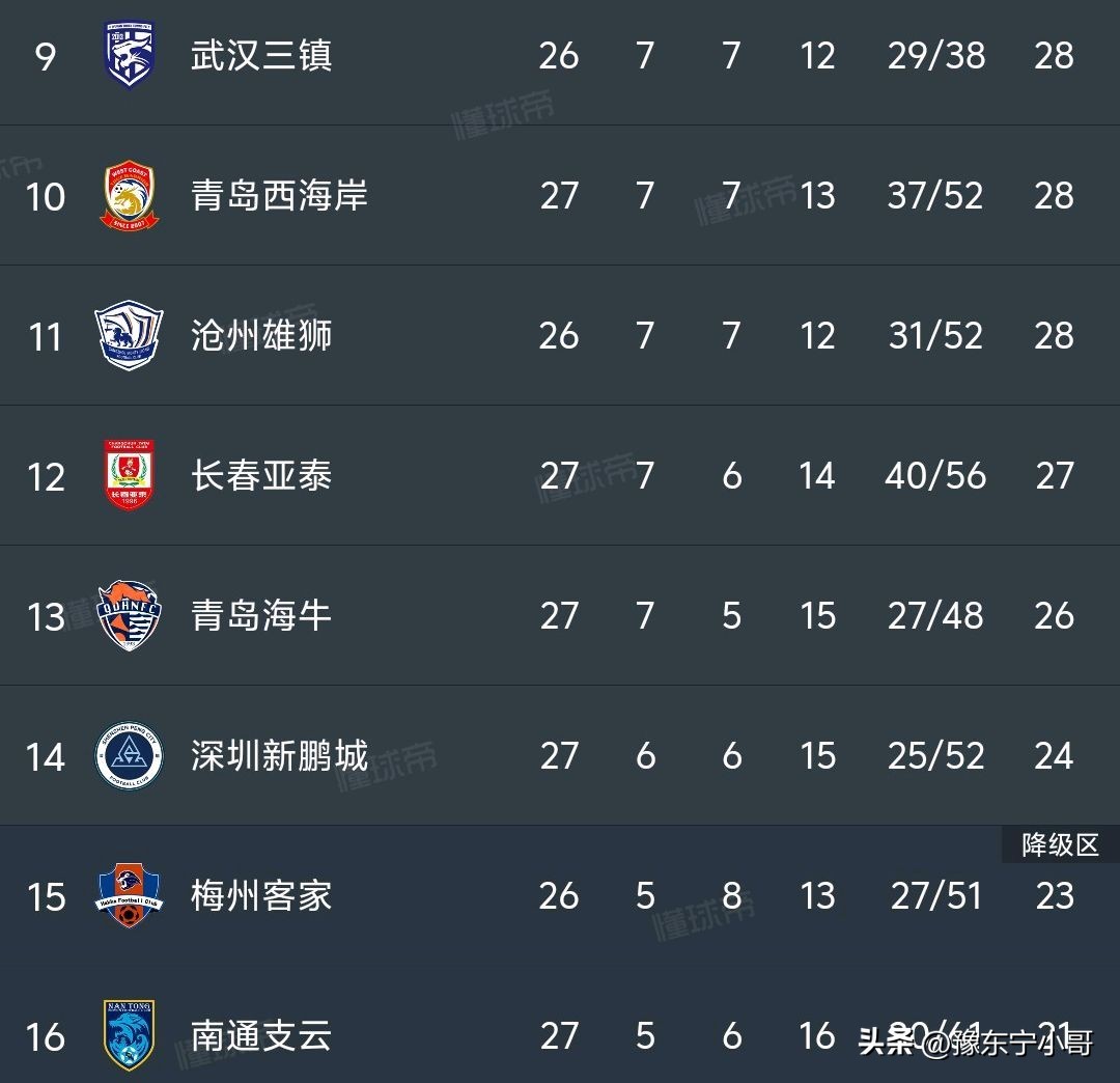 深圳新鹏城不敌山东泰山之后积分停留在了24分,仅仅领先倒数第二梅州客家(少赛一场)一分,领先倒数第一的南通支云3分,保级压力陡然上升!