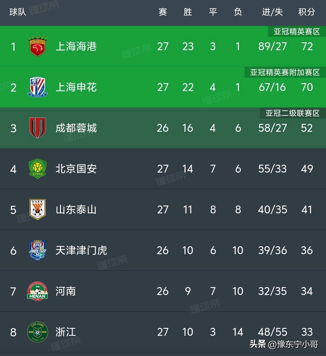 至此除了明日河南酒祖杜康与武汉三镇,成都蓉城和梅州客家,天津津门虎与沧州雄狮的比赛之外,中超联赛最新积分榜如下:其中上海双雄依旧稳居前二,几乎提前包揽冠亚军,成都蓉城少赛一场52分第三,北京国安3分之差第四