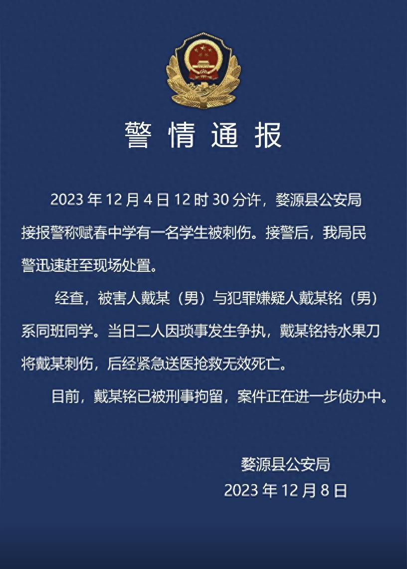 12月8日晚,江西婺源公安官方抖音号发布警情通报,12月4日12时30分许,婺源县公安局接报警称赋春中学有一名学生被刺伤。经查,被害人戴某(男)与犯罪嫌疑人戴某铭(男)系同班同学。当日二人因琐事发生争执,戴某铭持水果刀将戴某刺伤,后经紧急送医抢救无效死亡。目前,戴某铭已被刑事拘留,案件正在进一步侦办中。