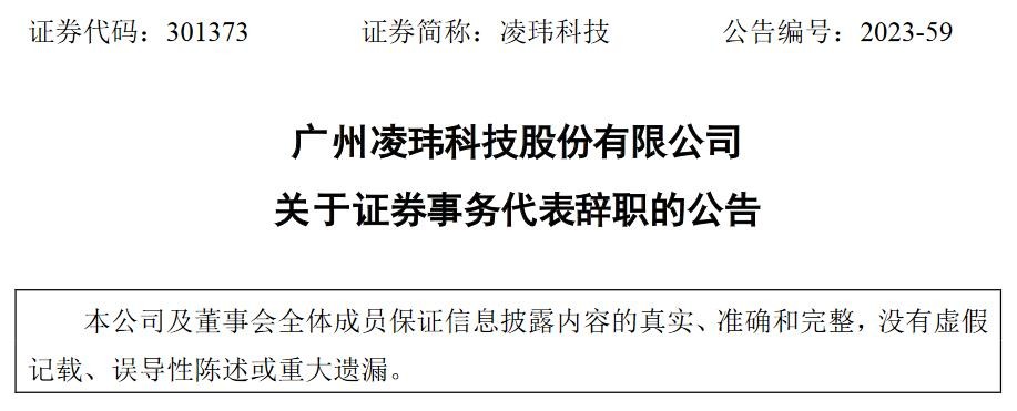 凌玮科技(301373)于9月15日发布晚间公告称,广州凌玮科技股份有限公司(以下简称 “公司”)董事会于近日收到证券事务代表梁瑶女士提交的书面辞职报告,因个人原因,梁瑶女士申请辞去公司证券事务代表的职务,辞职后将不在公司及子公司担任任何职务,辞职报告自送达董事会之日起生效。
