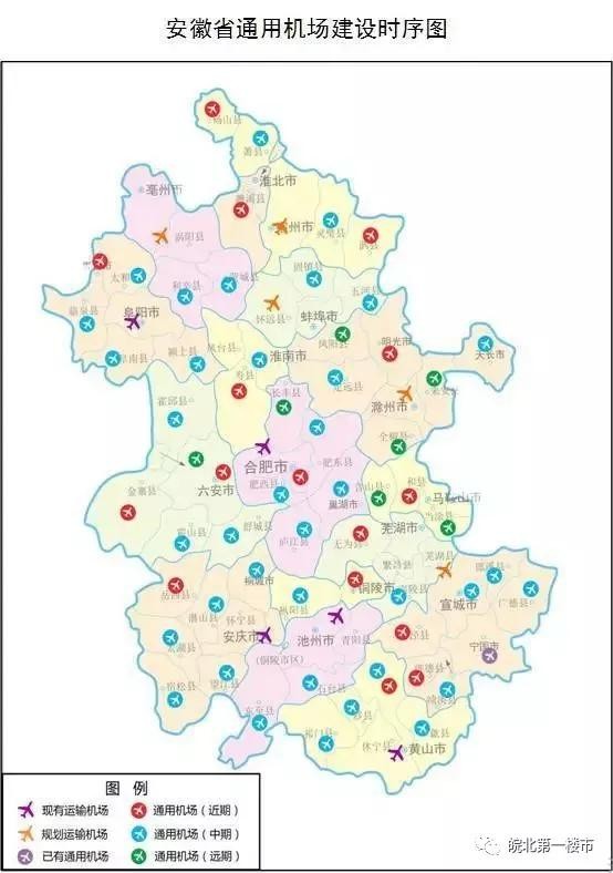 阜阳处于皖北通用机场群,将建设临泉、太和,颍上,阜南,界首5个通用机场。临泉、太和,颍上,阜南通用机场将在2021-2025年建设,界首通用机场将在2017-2020年建设。