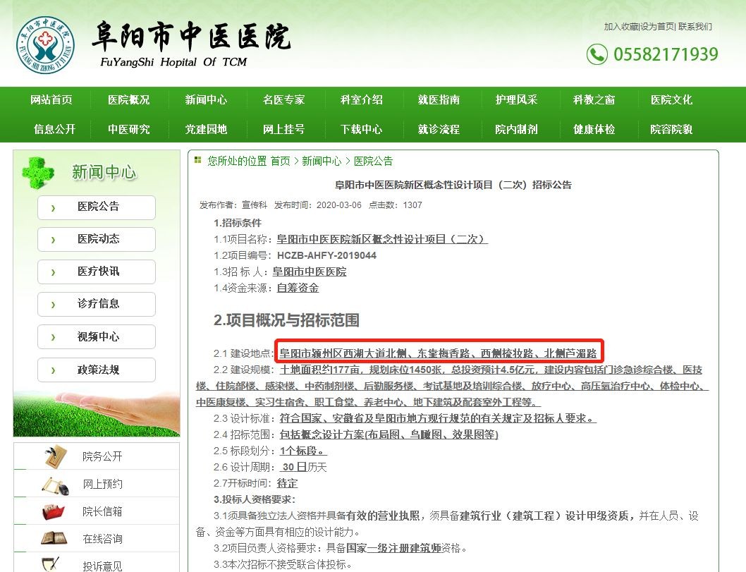 今年3月份,阜阳市中医院在其官网发布:阜阳市中医医院新区概念性设计项目(二次)招标公告。