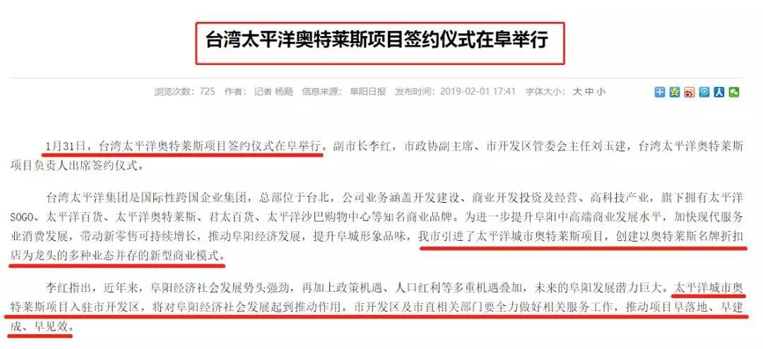 2019年台湾太平洋奥特莱斯项目签约仪式在阜举行,将奥特莱斯项目正式落户阜阳开发区,打造以奥特莱斯名牌折扣店为龙头的多种业态并存的新型商业模式。