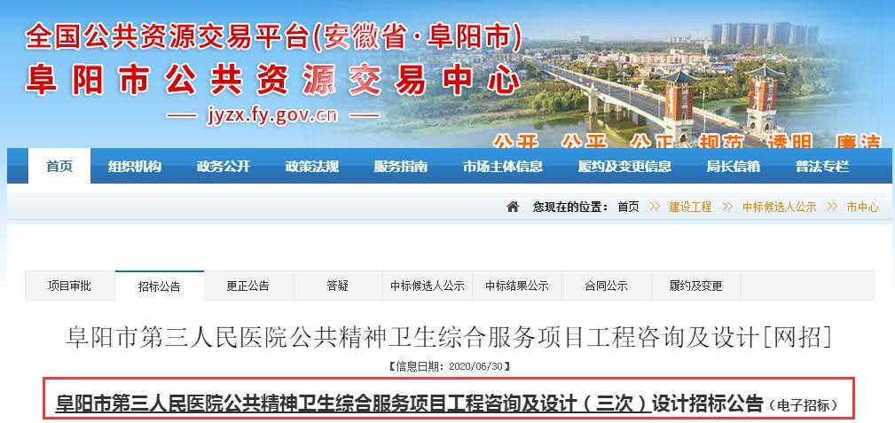 阜阳市第三人民医院公共精神卫生综合服务项目工程咨询及设计(三次)设计招标公告